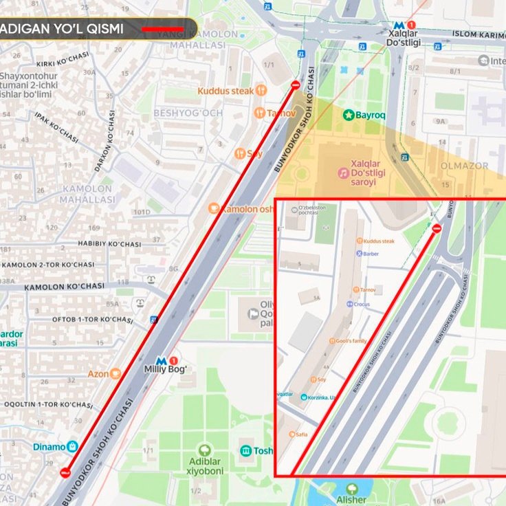 24/7 Bunyodkor yangi sayr-gastro ko‘chasida yirik tadbir o‘tkazilishi munosabati bilan ko‘chaning ichki dublyori 12-sentyabr soat 07:00 dan 15-sentyabr soat 07:00 gacha transport harakati uchun yopiq bo‘ladi.