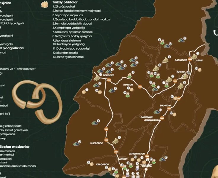 «Surxon vohasi – turizm uchburchagi» turistik xaritasi Surxondaryo viloyatidagi tarixiy yodgorliklar, muzeylar, ziyoratgohlar, milliy madaniyat markazlari va tabiat manzillarini uch nuqtali yo‘nalishda birlashtirib beradi. Ushbu xarita...