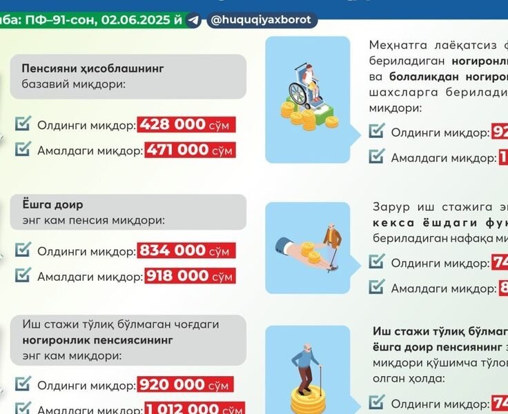 Bugundan O‘zbekistonda pensiya va nafaqalar miqdori 10 foizga oshirildi (Batafsil — infografikada). Pensiya va nafaqalarning amaldagi miqdori: – yoshga doir eng kam pensiya miqdori — oyiga...