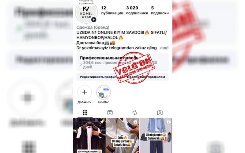 Joriy yil 11 iyun kuni Toshkent tumanida yashovchi fuqaro Instagram orqali ularga bog‘lanib, reklama qilingan kiyimni sotib olish uchun 1 million so‘mni ular ko‘rsatgan karta raqamiga o‘tkazib bergan. Biroq pul o‘tkazilgach, barcha yozishmalar o‘chirilib, muloqot to‘xtatilgan.