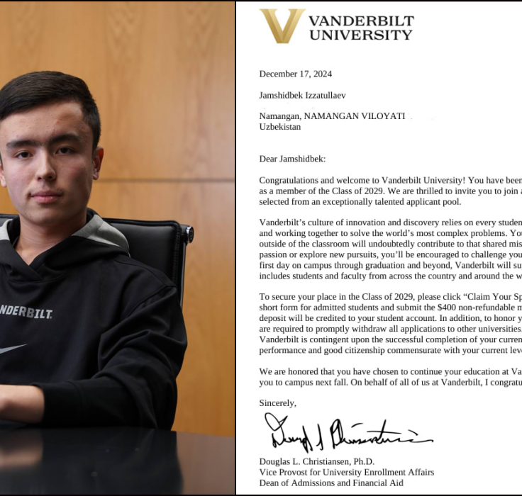 Miya ilmiga qiziquvchi namanganlik Jamshidbek Izzatullayev AQShning ta’lim sohasida birinchi raqamli Vanderbilt universitetiga 100 foizlik grant asosida qabul qilindi. Boshqacha aytganda, u shu universitetda o‘qish uchun 373 000 dollarlik grant sohibiga aylandi.