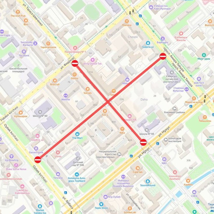 – Taras Shevchenko ko‘chasining Fidokor ko‘chasi kesishmasidan Nukus ko‘chasi kesishmasigacha;