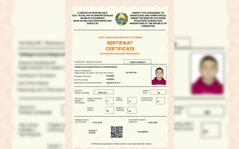 Parkentda 6-sinf o‘quvchisi arab tilidan B2 sertifikatini qo‘lga kiritdi