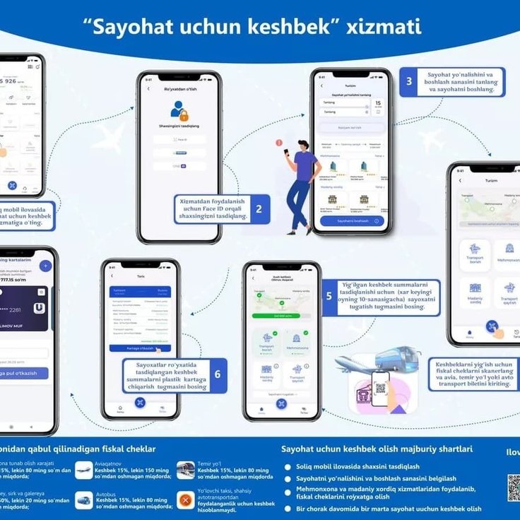 – Keshbeklarni yig‘ish uchun siz avia, temir yo‘l, avtobus biletlarini hamda mexmonxonalar va madaniyat tashkilotlarining fiskal cheklarini (QR kod) skanerlash orqali ilovaga kiritasiz;