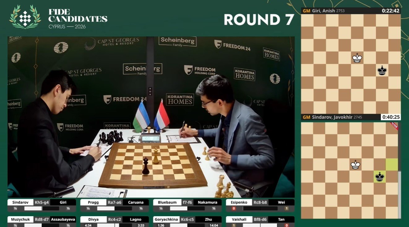 O‘zbekistonlik grossmeyster Javohir Sindorov 5 aprel kuni Nomzodlar turnirining 7-turida jahon reytingida 8-o‘rinda turuvchi niderlandiyalik Anish Giri bilan durang o‘ynadi.