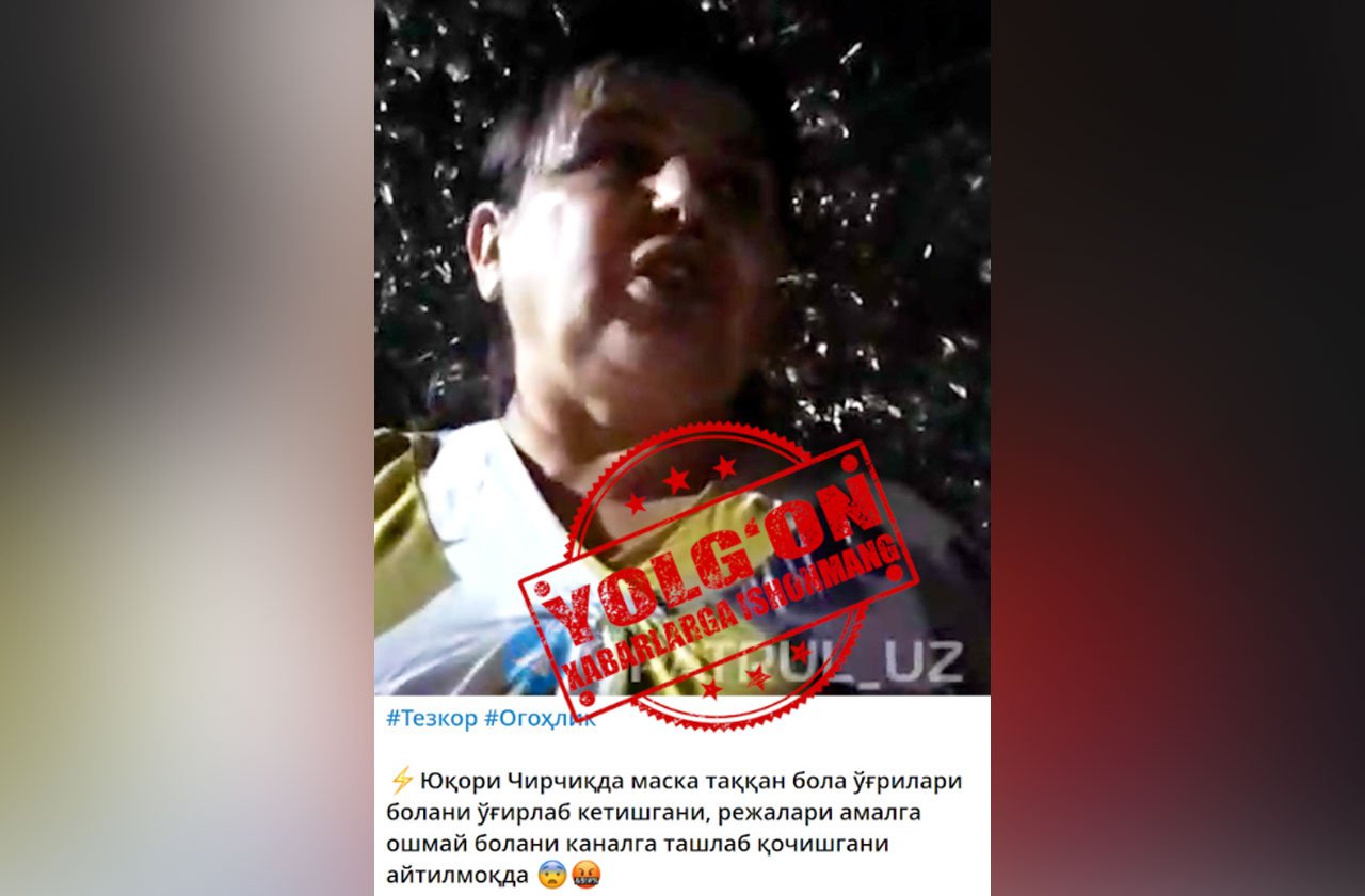 Viloyat IIBBning bildirishicha, 9 sentabr kuni Yuqori Chirchiq tumani «Taraqqiyot» mahallasida yashovchi voyaga yetmagan shaxs yaqinlariga aytmasdan boshqa mahallada yashayotgan do‘stining uyiga ketgan. Oradan vaqt o‘tib qarindoshlari uni topganda noqulay vaziyatdan chiqish uchun “meni o‘g‘irlab ketmoqchi bo‘lishdi” degan mazmunda gapirgan va buni eshitgan yaqinlari ichki ishlar organlariga xabar bergan.