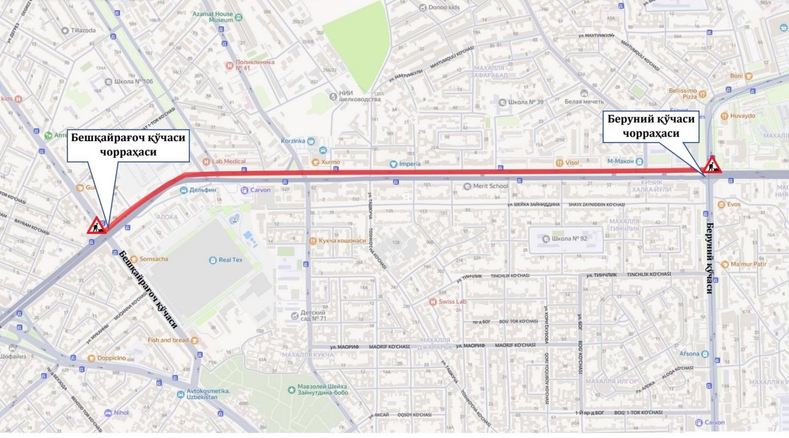 Bundan tashqari, Mingbuloq ko‘chasidan Shukur Burhonov ko‘chasiga harakatlanish ham vaqtincha cheklanadi.